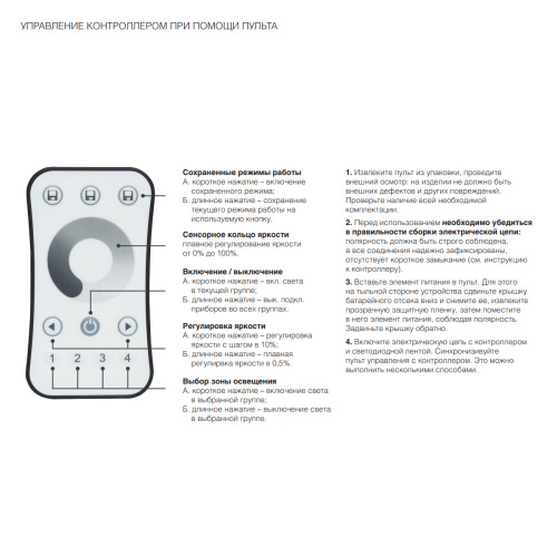 Пульт предназначен для дистанционного управления монохромными светодиодными лентами, подключенных к контроллерам DIM.