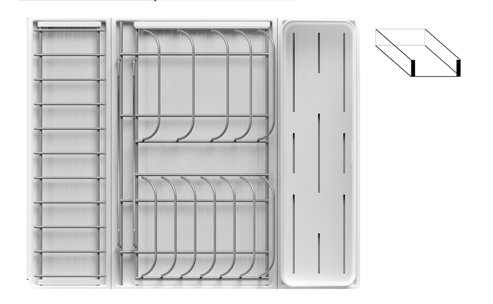 - 1 большой модуль для посуды + 1 малый модуль с решеткой + модуль для столовых приборов