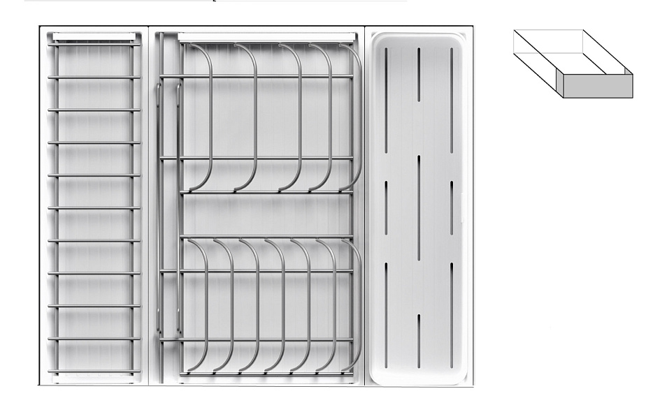 • 1 большой модуль для посуды + 1 малый модуль с решеткой + модуль для столовых приборов