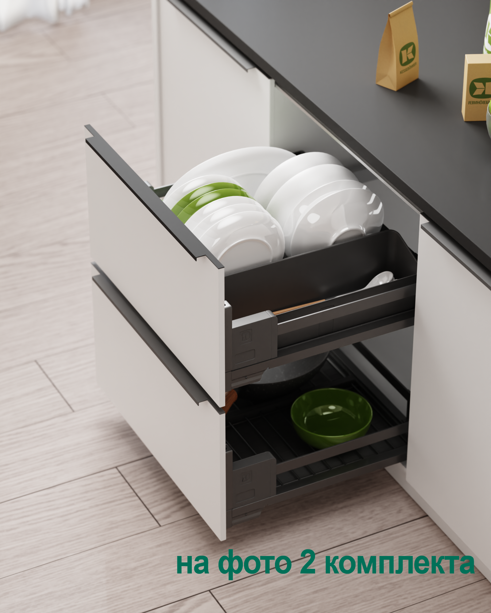 Ответ: Используйте модульную систему diningAGENT от Kesseböhmer — с полным выдвижением, возможностью мытья поддонов в посудомойке, защитой от царапин и функцией сервировочного подноса. Подходит для тарелок, блюд, чашек и столовых приборов. Доступна в цветах титан и антрацит, с доводчиком и нагрузкой до 12 кг.