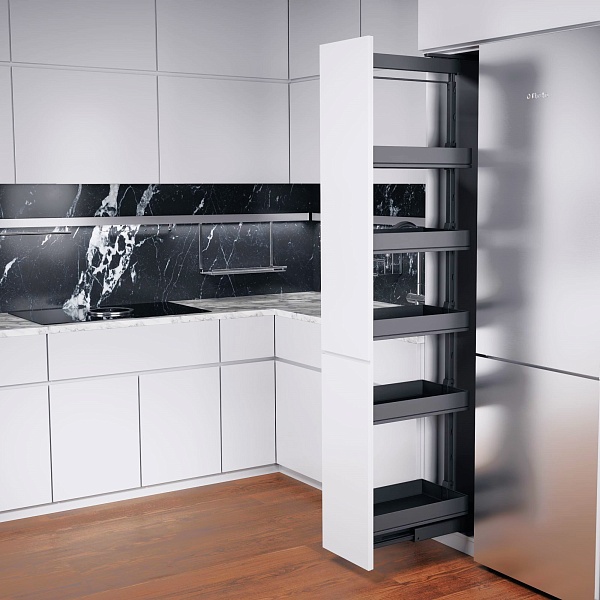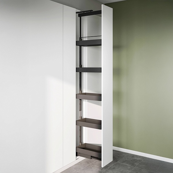 • Высокая нагрузка на механизм в 100 кг (по 18 кг на полку) позволяет организовать хранение большому количеству предметов, при этом даже при полной загрузке система выдвигается легко.