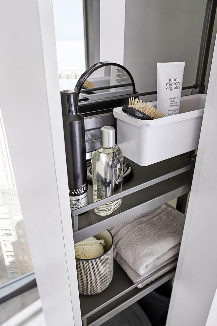 Благодаря высококачественным материалам, идеально подобранным комплектующим и продуманному инженерному решению механизм Dispensa можно использовать в помещениях с повышенной влажностью, таких как ванные комнаты. Даже в небольшом помещении колонна займет минимум места, но при этом создаст максимум полезного пространства для хранения любых принадлежностей. Полотенца, баночки с кремом, лосьоны для тела, щетки, расчески, фен, декоративная косметика, туалетная бумага и салфетки – они всегда будут в нужном месте в нужное время. Полки регулируются по высоте, поэтому даже высоким бутылкам с шампунями легко найдется место!